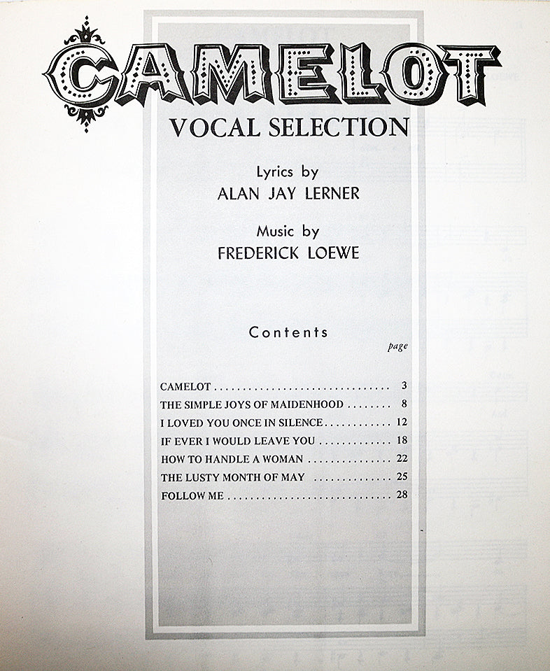 Piano-Vocal songbook featuring songs form the Broadway show Camelot.
