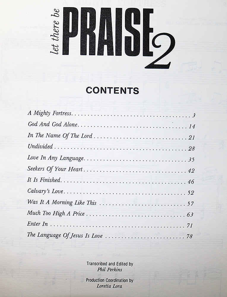 Let There Be Praise 2 features medium-voice arrangements of popular contemporary Christian songs, arranged by Phil Perkins for accessible and expressive performance. Sparrow notes that the collection continues the spirit of the first volume with “powerful praise selections for today’s worshipping church.”