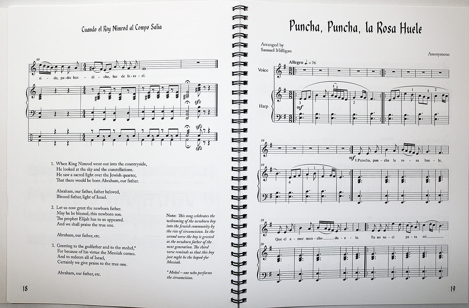 In Nine Sephardic Songs, Milligan arranges nine traditional Ladino melodies (both sacred and secular) with harp accompaniment, offering texts in Ladino and English translations for vocalists. According to the publisher, the volume “fills a specific niche in available harp music,” and reviewers acclaim it as “a wonderful addition to the harp and voice repertoire… a treasured volume.”