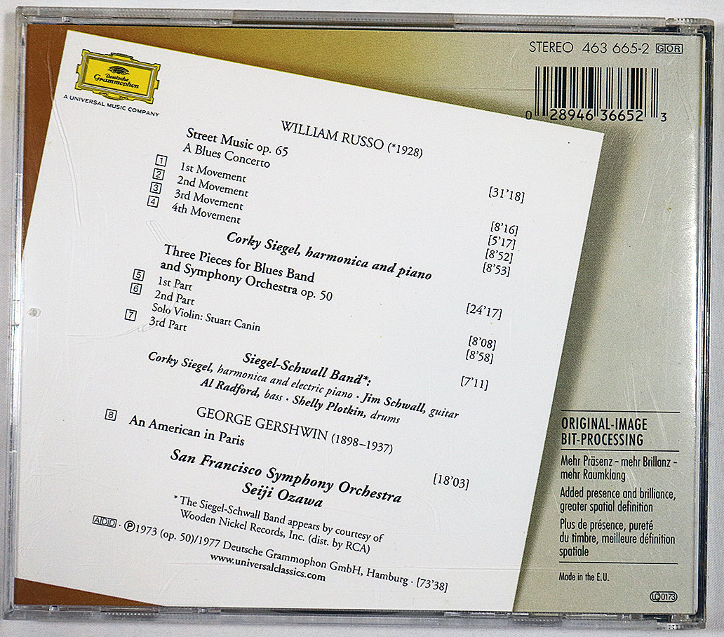 This Deutsche Grammophon release features conductor Seiji Ozawa and the San Francisco Symphony in a pairing of William Russo’s Street Music and George Gershwin’s quintessential tone-poem An American in Paris. Critics praise the Gershwin recording for sounding “quite lively and strongly flavorful.” A valuable addition for listeners who enjoy the crossover of classical orchestration and jazz-inflected American modernism.