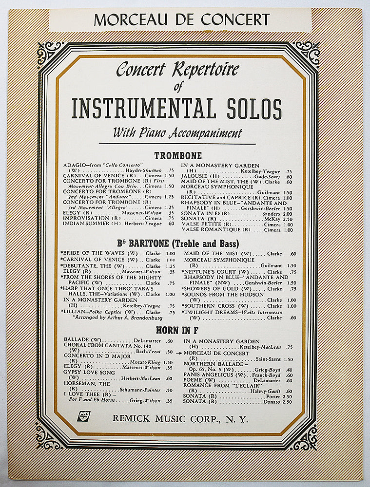 Horn and piano arrangement of Morceau de Concert by Camille Saint-Saens. Includes separate part for horn.