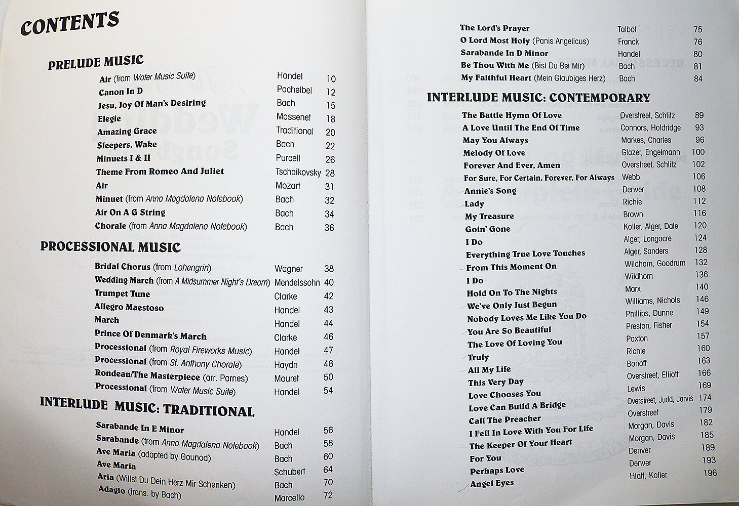 The Perfect Wedding Songbook offers a versatile collection of songs specially arranged for weddings, including ceremony, prelude and reception repertoire across genres. As one description notes: “From standards to pop to country, this collection spans generations and genres to include the perfect song for any couple’s big day.”